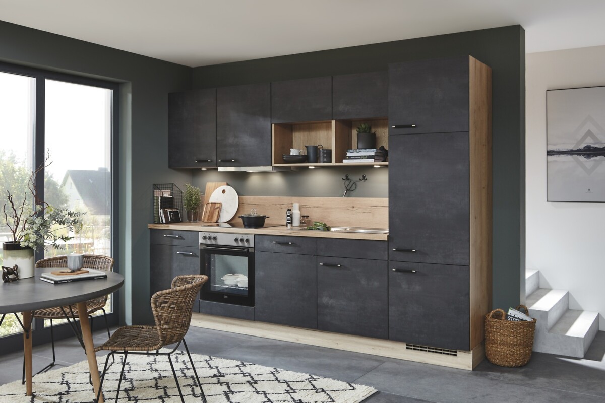 Sie erhalten diese Einbauküche wie abgebildet in Schwarz-Beton (Fronten und Korpus) und die Arbeitsplatte in Wildeiche Nachbildung.