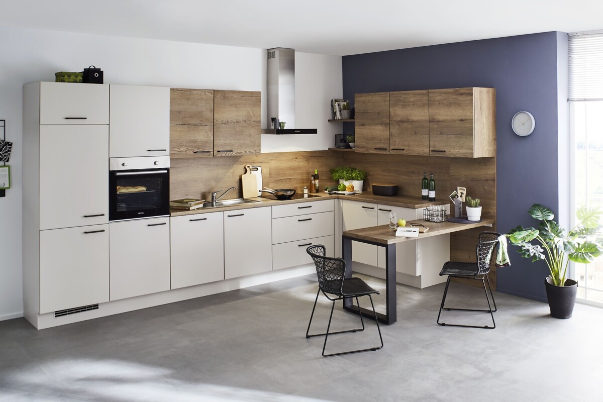 Sie erhalten diese Einbauküche wie abgebildet in Sand Nachbildung (Fronten und Korpus), abgesetzt mit Eiche Havanna Nachbildung (Arbeitsplatte, Nischenverkleidung, Korpus und Fronten).