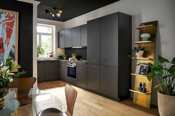 Sie erhalten diese Einbauküche wie abgebildet in Lavaschwarz (Fronten und Korpus). Die Arbeitsplatte ist veränderbar, hier in Lavaschwarz.