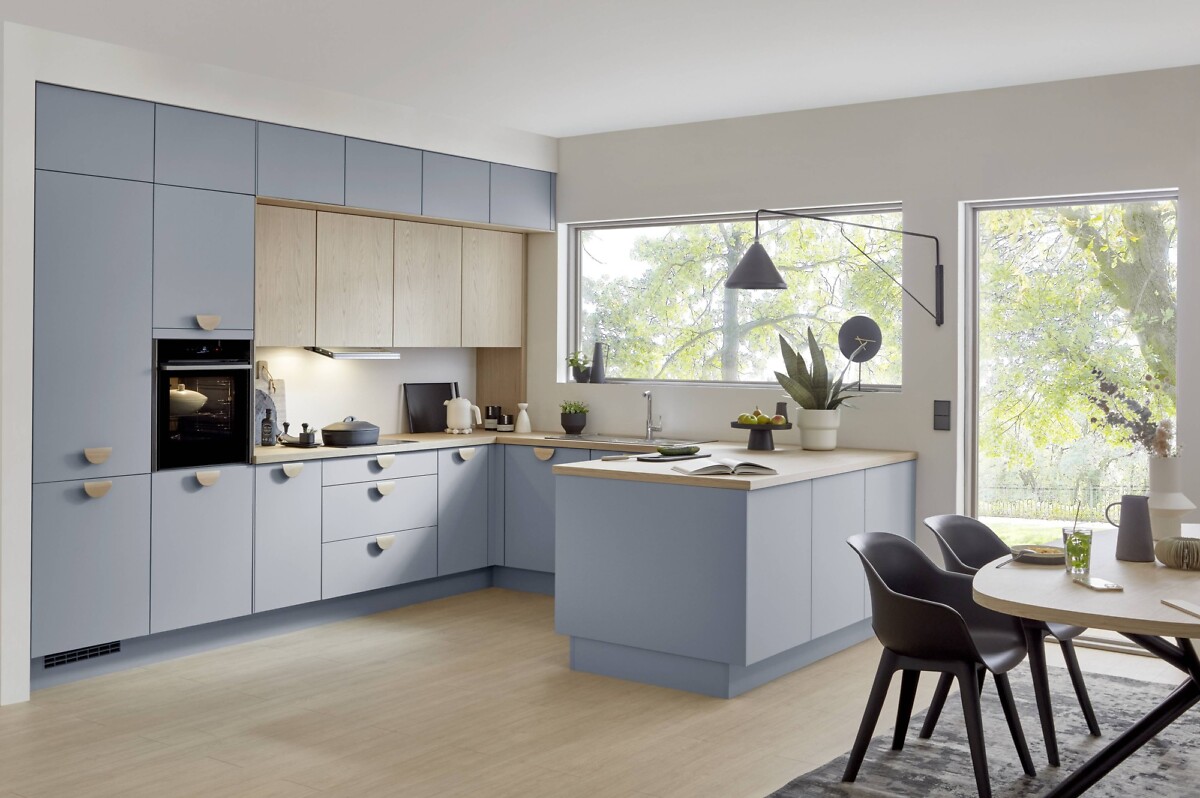 Die Arbeitplatte in Eiche nachlidung schafft einen wohnlichen Charakter und hellblaue Front bringt viel Farbe in die Küche.