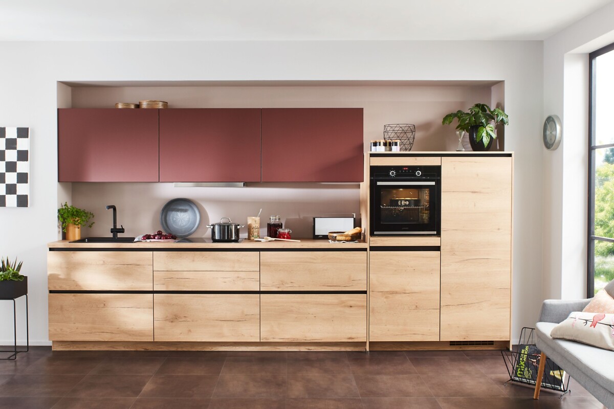 Sie erhalten diese Einbauküche wie abgebildet in Eiche Sierra Nachbildung (Fronten, Korpus, Arbeitsplatte ) mit Rostrot Ultramatt Nachbildung (Front und Hängeschränke) abgesetzt.