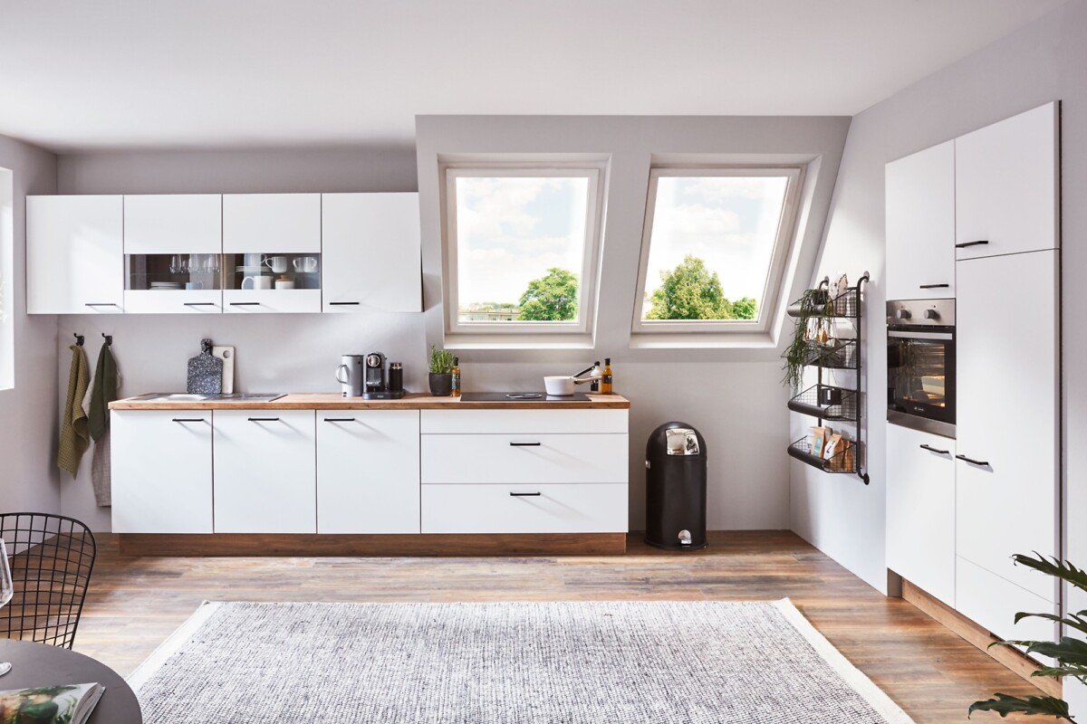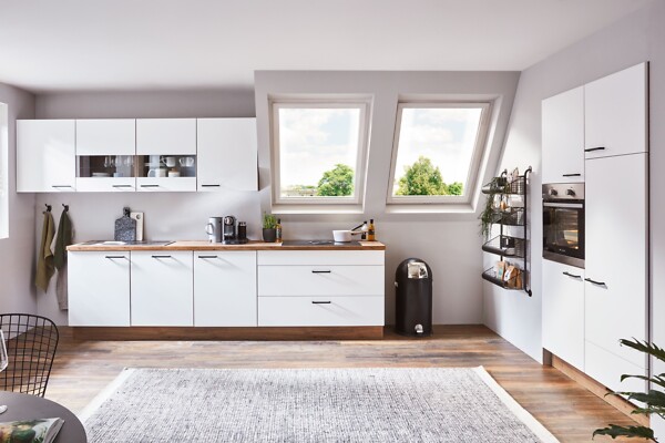 Sie erhalten diese Einbauküche wie abgebildet in Alpinweiß - Samtweiß (Fronten und Korpus) , sowie die Arbeitsplatte in Wildeiche Nachbildung.