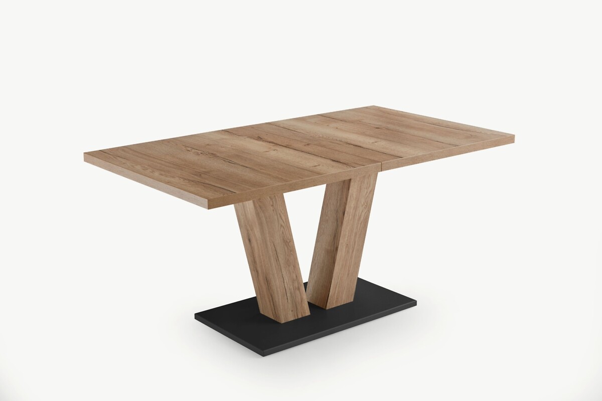 Diesen rechteckigen Esstisch mit dem eleganten V-Fußgestell erhalten Sie mit zwei innenliegenden Einlegplatten ca 40 cm und mit Synchronauszug. Der Esstisch ist in Decor Halifax Natur. Die Bodenplatte ist schwarz.