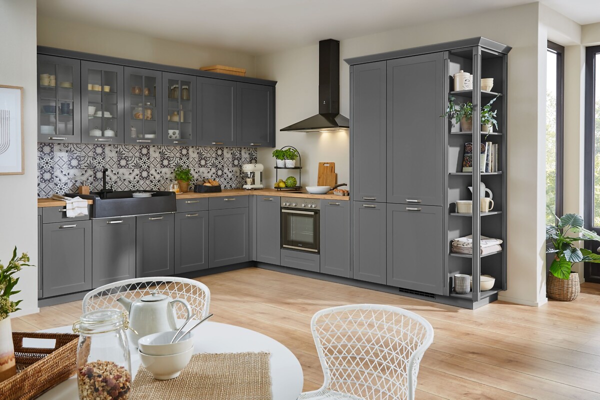 Sie erhalten diese Einbauküche wie abgebildet in Nordic Schiefergrau (Fronten, Korpus) Die Arbeitsplatte in Eiche Nachbildung und die Nische ist im Deckor Floral blau.