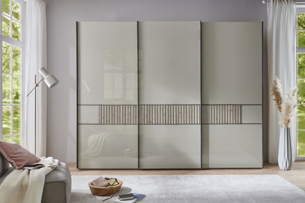 Die Glas-Fronten und der Korpus (Holzwerkstoff) erhalten Sie in modenen Kieselgrau (Hellgrau). Der Kleiderschrank Delia erhalten Sie mit 3 Schwebetüren. Jeweils mit eingerücken Querriegel mit Lamellen im Korpusfarbton. Inkl. Dämpfern. Die Griffleiste ist in Anthrazit. Maße ca. B/H/T 250 x 217 x 68 cm.