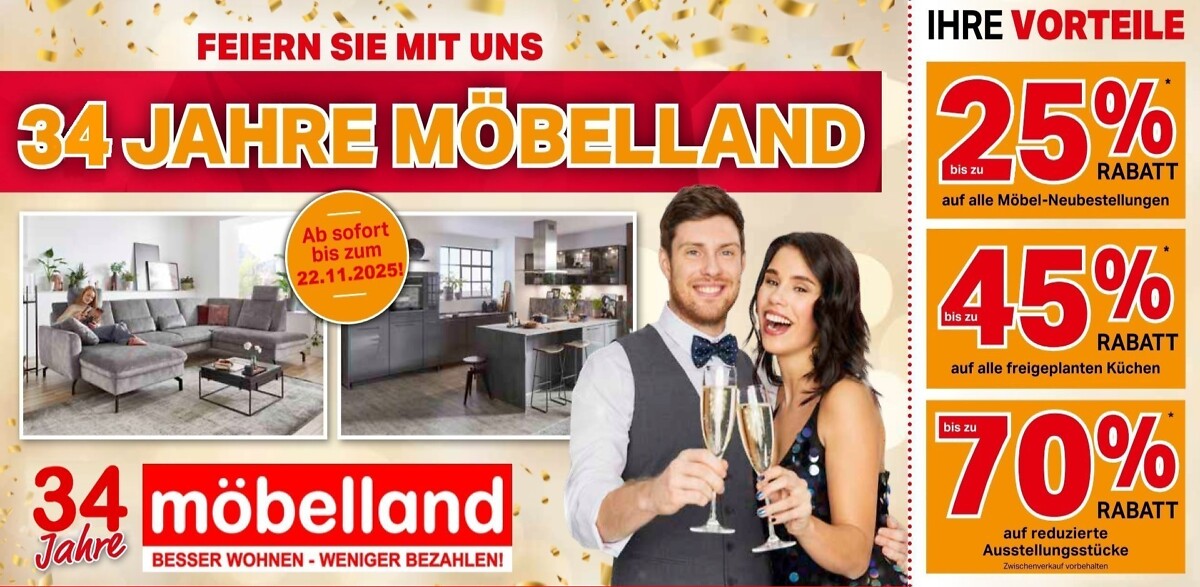feiern Sie mit uns 34 Jahre Möbelland und profitieren Sie von großartigen Angeboten. Ab sofort gibt es im Rahmen unseres Jubiläums fantastische Jubiläums-Vorteile mit